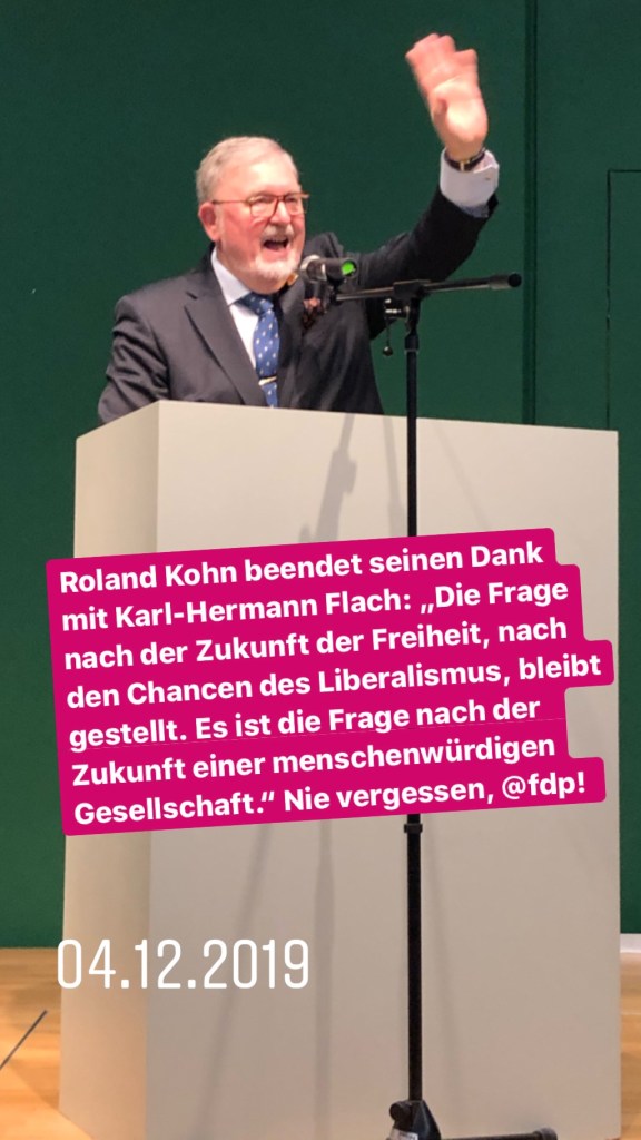 Und ich will sprechen über ein Herzensthema, das Roland Kohn und mich verbindet – über liberales Ethos, über einen gewissen Freisinn, der zugleich ein Gemeinsinn ist. Das hat dann Konsequenzen für die Positionierung der FDP, aber auch für die Klimapolitik, wie ich deutlich machen will.
