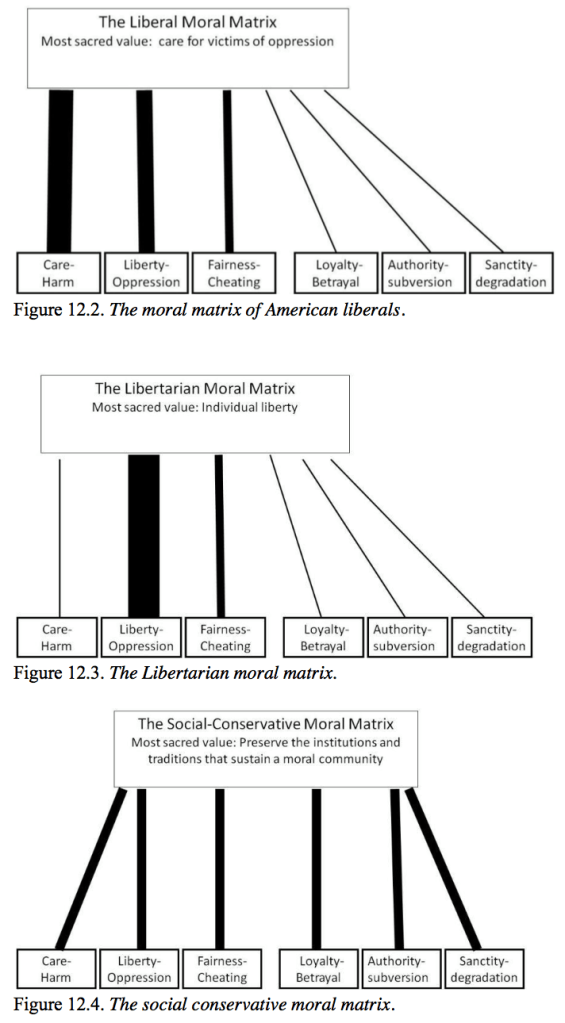 Wie diese moralischen Intuitionen verteilt sind, hat Jonathan Haidt mit vielen Kolleginnen und Kollegen weltweit erforscht (mit Updates). Mit Hilfe der politischen Selbsteinschätzung der Befragen unterscheiden Haidt und Kollegen drei typische Cluster: liberale, libertäre und konservative Moral.