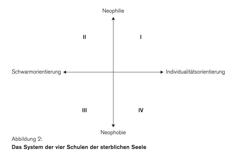 Im „System der vier Schulen der sterblichen Seele“ unterscheidet Buschmann zwei Achsen zwischen „Neophilie“ und „Neophobie“ sowie zwischen „Schwarmorientierung“ und „Individualitätsorientierung“. Also: Manche lieben, Andere Fürchten das Neue. Die Einen finden die Gemeinschaft wichtiger als das Individuum, Andere messen die Gemeinschaft am Umgang mit dem Individuum. Für die FDP nimmt Buschmann einen optimistischen, fortschrittsorientierten Individualismus in Anspruch, der sich in Quadrant I (rechts oben) befindet. Er unterscheidet sich vom „Sozialutopismus“ (Quadrant II), der Patriarchenherrschaft (III) und dem ständischen Konservatismus (IV).
